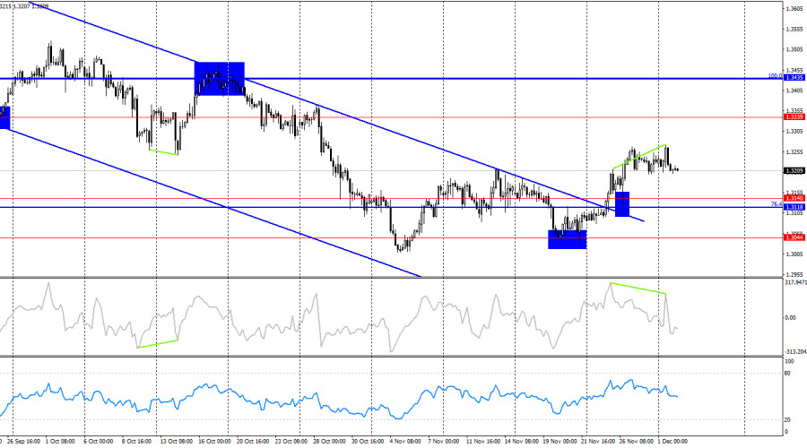 كانت هناك أحداث إخبارية قليلة يوم الاثنين. لم يجذب مؤشر مديري المشتريات التصنيعي في المملكة المتحدة الانتباه، بينما تسبب المؤشر المكافئ في الولايات المتحدة في رد فعل مختلط في السوق. في رأيي، تشكل نطاق جانبي آخر في السوق، وهذا يوضح كل شيء. لن تكون هناك أخبار مهمة اليوم، لذا قد نشهد طوال اليوم حركات غير معتادة داخل القناة الأفقية. لقد أخذ الثيران زمام المبادرة في السوق، لكنهم يفتقرون إلى القوة لدفع الجنيه باستمرار نحو الأعلى. قد ينتج عن الاجتماع القادم للجنة السوق المفتوحة الفيدرالية قرار بتخفيف السياسة النقدية، لكن دعني أذكرك أن اللجنة تعتمد على بيانات سوق العمل والبطالة والتضخم. ولم تكن هناك أرقام جديدة لهذه المؤشرات. هذا الأسبوع، سنضطر إلى الاكتفاء بتقرير ADP فقط، الذي لا يعكس بشكل كامل الحالة الفعلية لسوق العمل في الولايات المتحدة. وبالتالي، لا يتسرع الدببة ولا الثيران في شن هجمات جديدة، لأن لا أحد يفهم حاليًا ما القرار الذي سيتم اتخاذه بشأن الأسعار في ديسمبر.