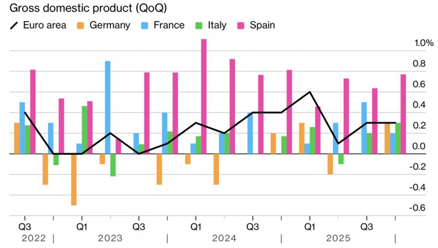 През четвъртото тримесечие БВП на региона на еврото се разшири с 0.3%, което надмина консенсусните прогнози на Bloomberg. Три от четирите най-големи икономики в района на еврото — Германия, Италия и Испания — превишиха очакванията, като Испания потвърди своята роля на локомотив на растежа, разширявайки се с 0.8%.