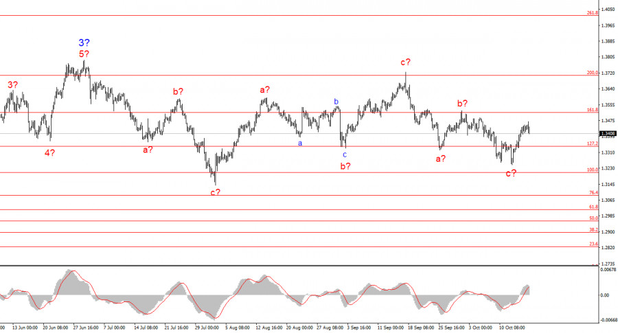 最近幾週,市場有理由重新購買歐元和英鎊,但它並未急於做出決定。幾乎所有關於美國經濟的關鍵問題仍然完全不確定。中美貿易戰升級的下一輪將如何結束仍然未知。唐納德·特朗普與習近平之間的談判是否會進行仍然未知。美聯儲在即將召開的會議上將採取什麼行動仍不清楚。政府“關門”什麼時候會結束未知。美國的勞動市場和通脹的真實狀況仍然是個謎。基於這一切,市場仍然處於不確定狀態,傾向於在有限範圍內交易,而非做出輕率的行動。因此,最近幾個月,我們僅看到交替出現的修正結構。