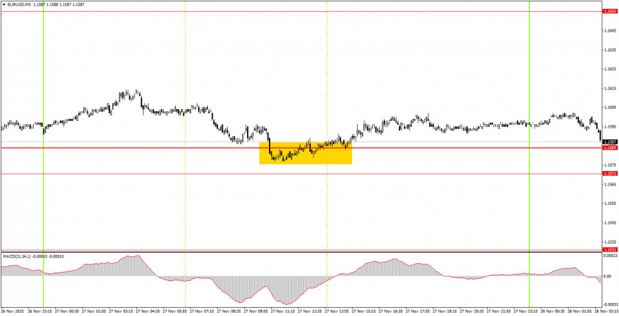 在週四的5分鐘時間框架中,恰好產生了一個交易信號。在美洲交易時段的開始,價格從1.1571-1.1584區域反彈,但僅上漲約10個點。再次提醒您,如果市場波動性低,對交易者而言有哪些可用的水平或產生了什麼信號並不重要。今天早上,匯價再次接近1.1571-1.1584區域,因此可能會再次發生反彈。