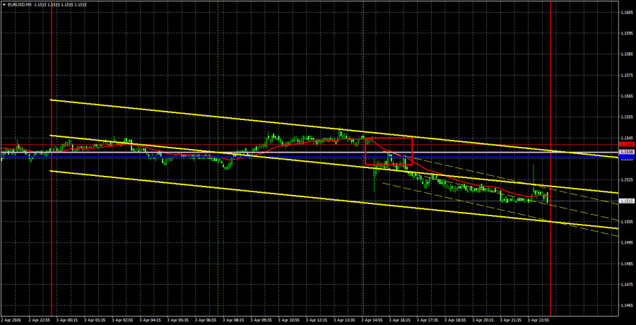 週五整個交易日內,EUR/USD 貨幣對幾乎毫無波動。即便是對市場極為重要、且三月數據表現相當亮眼的非農就業(Non-Farm Payrolls)與失業率報告,也未能帶動行情變化。市場目前的焦點高度集中在地緣政治上,以至於連這樣的報告都幾乎被忽視。近幾週以來,EUR/USD 大致穩定在 1.1444–1.1625 的區間內。嚴格來說,這並不能被視為經典意義上的震盪區間,因為所有走勢幾乎完全是由瞬息萬變的地緣政治形勢所主導。