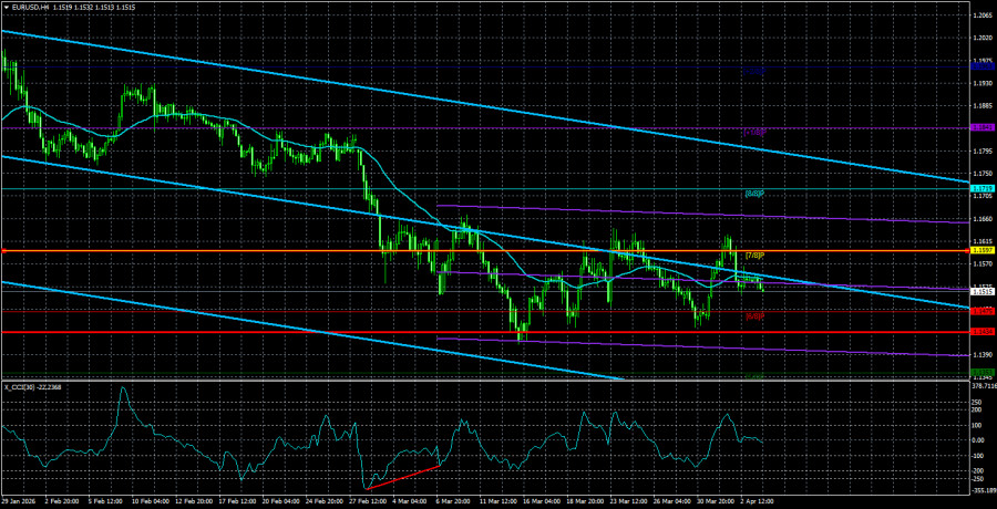 截至4月6日,EUR/USD 貨幣對在過去 5 個交易日的平均波動幅度為 81 點(pips),屬於「中等」波動。我們預計該貨幣對在週一將於 1.1434 與 1.1596 之間波動。上方線性回歸通道已經轉向下行,顯示趨勢出現變化。CCI 指標已進入超賣區並形成「看漲」背離,再次發出下跌趨勢即將結束的警訊。