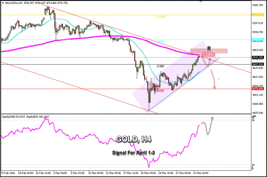 Zlato se obchoduje kolem 4 776 USD a dosahuje úrovní rezistence. Tato zóna se shoduje s horním pásmem kanálu klesajícího trendu, který se formuje od 26. února. Kolem této oblasti na 4 809 USD se nachází 200denní EMA, takže zlato může mít potíže s dalším růstem nad tuto zónu.