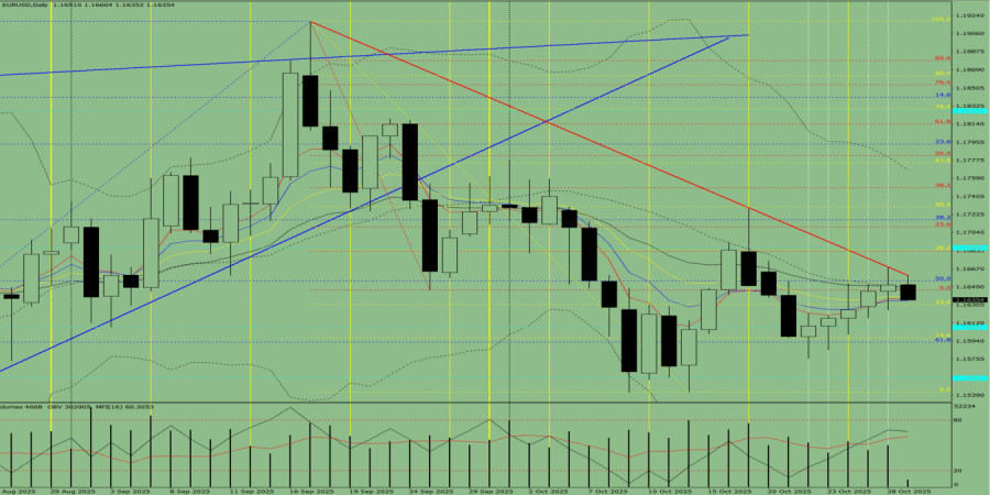 Od úrovně 1,1651 (zavírací cena včerejší denní svíčky) může cena začít klesat směrem k 1,1608 – historické úrovni rezistence (modrá přerušovaná čára). Při testování této úrovně se cena může případně odrazit směrem nahoru k 1,1617 – dolní fraktál (denní svíčka z 27. října 2025).