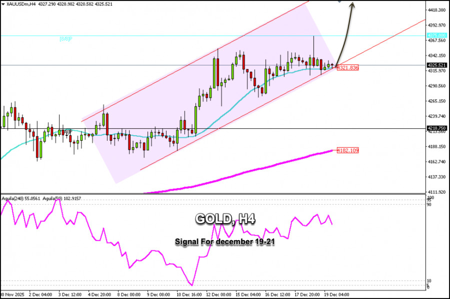 Laut dem H4-Chart sehen wir, dass Gold den Abwärtstrendkanal testet, was bedeutet, dass in den kommenden Stunden ein technischer Rücksetzer wahrscheinlich ist, falls der Preis sich oberhalb von $4.320 (21 SMA) konsolidiert.