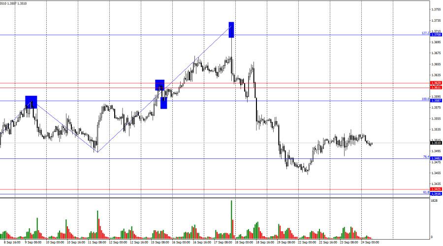 Sur le graphique horaire, la paire GBP/USD a évolué latéralement mardi, légèrement au-dessus du niveau de retracement de 76,4 % à 1,3482. Ainsi, le processus de croissance pourrait se poursuivre vers le prochain niveau de retracement de 100,0 % à 1,3587. Une consolidation du taux de la paire en dessous de 1,3482 favoriserait la monnaie américaine et une reprise de la baisse vers la zone de support de 1,3416–1,3425.