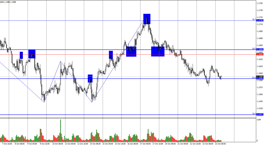 Mercredi, la paire EUR/USD a tenté de prolonger sa baisse mais n'a pas réussi à se consolider en dessous du niveau de retracement de Fibonacci de 61,8 % à 1,1594. Un rebond à partir de ce niveau favorisera la monnaie européenne et une certaine remontée vers le niveau de résistance de 1,1645–1,1656. Une consolidation du taux de la paire en dessous de 1,1594 augmentera la probabilité d'une nouvelle baisse vers le prochain niveau de Fibonacci de 76,4 % – 1,1517. Il convient de noter que la tendance actuelle reste haussière.