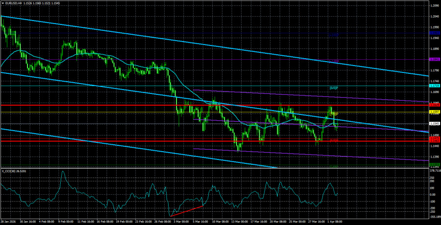 The average volatility of the EUR/USD currency pair over the last 5 trading days as of April 3 is 83 pips, which is considered "average." We expect the pair to trade between 1.1463 and 1.1629 on Friday. The upper channel of linear regression has turned downward, indicating a change in trend. The CCI indicator has entered the oversold area and formed a "bullish" divergence, which once again warns of the completion of the downward trend.
