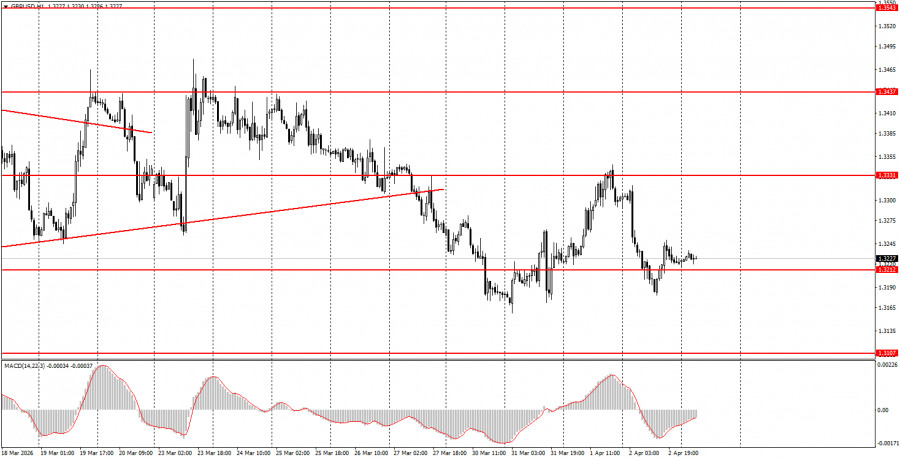 On the 5-minute timeframe, levels to consider for trading now include: 1.3096-1.3107, 1.3203-1.3212, 1.3259-1.3267, 1.3319-1.3331, 1.3403-1.3407, 1.3437-1.3446, 1.3484-1.3489, 1.3529-1.3543, 1.3643-1.3652, 1.3695, and 1.3741-1.3751. Today, there are no important events scheduled in the UK, while in the US, critical Non-Farm Payroll and unemployment reports will be released. These reports could provoke either a strong movement in either direction or a rather weak market reaction.