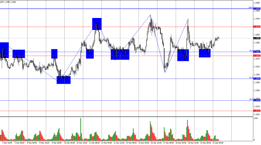 Pada hari Jumaat, latar belakang berita untuk GBP/USD dilengkapi dengan laporan jualan runcit. Ternyata jualan telah jatuh sebanyak 0.1% m/m dan meningkat sebanyak 0.6% y/y pada bulan November. Angka-angka ini lebih buruk daripada jangkaan pasaran, namun pound masih berjaya menunjukkan sedikit pertumbuhan pada hari tersebut. Saya percaya pertumbuhan ini adalah disebabkan semata-mata oleh lantunan teknikal dari paras 1.3352–1.3362 dan tiada yang lain. Seperti yang telah saya katakan, pasangan ini sedang berdagang secara mendatar, jadi sempadan julat ini adalah sangat penting. Hari ini, UK akan mengeluarkan laporan KDNK untuk suku ketiga, tetapi pedagang berkemungkinan tidak dapat meninggalkan julat 1.3352–1.3425. Ekonomi UK sangat jarang memberikan sokongan kepada bull. Satu-satunya acara yang ketara minggu ini akan berlaku pada hari Selasa. Tahun ini berakhir dalam julat mendatar untuk pound; pedagang sudah penat dan menangguhkan pembukaan kedudukan jangka panjang hingga tahun depan. Oleh itu, saya menjangkakan hanya pergerakan pasaran yang lemah sehingga akhir tahun semasa.