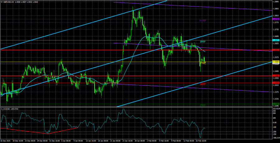 Purata volatiliti pasangan GBP/USD bagi 5 hari dagangan terakhir ialah 74 pip. Bagi pasangan pound/dolar, nilai ini dianggap sebagai tahap "sederhana". Pada hari Khamis, 19 Februari, kami menjangkakan pergerakan dalam julat 1.3468 hingga 1.3616. Saluran atas regresi linear sedang menghala ke atas, menunjukkan pemulihan aliran. Penunjuk CCI telah memasuki zon terlebih jual, menandakan kemungkinan berakhirnya fasa pembetulan.