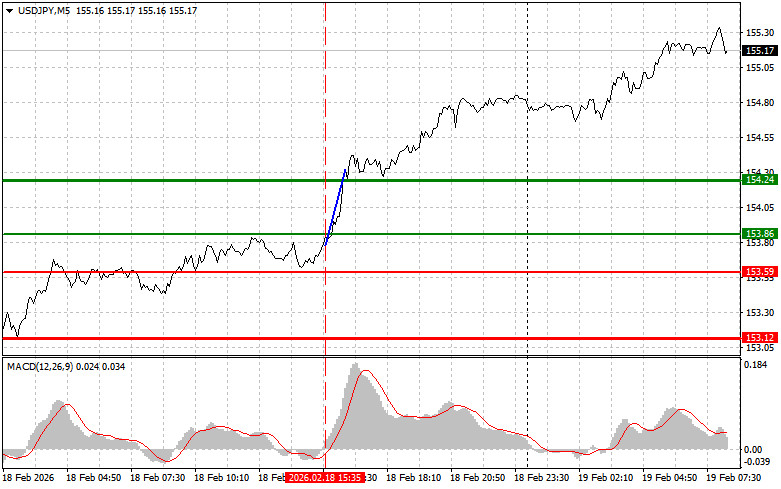 Ujian harga pada 153.86 bertepatan dengan penunjuk MACD yang baru mula bergerak ke atas dari paras sifar, mengesahkan titik masuk yang baik untuk membeli dolar. Hasilnya, pasangan ini naik ke arah paras sasaran 154.24.