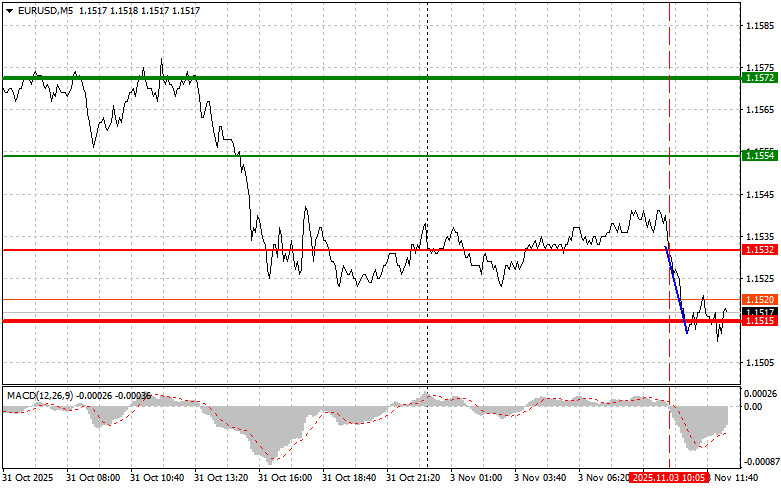 O teste de preço em 1,1532 ocorreu no momento em que o indicador MACD começou a se mover para baixo a partir da linha zero, confirmando um ponto de entrada válido para a venda do euro. Como resultado, o par caiu cerca de 20 pontos.
