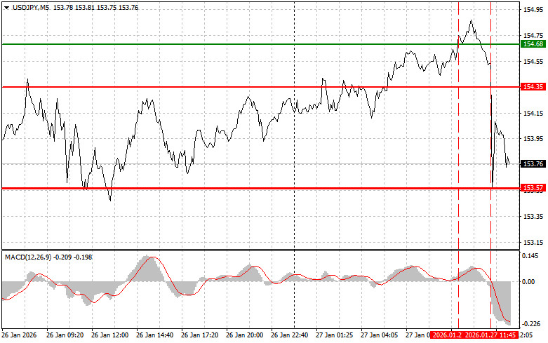 Cenário 1: Hoje, planejo comprar USD/JPY quando o preço atingir o nível de entrada em torno de 154,13 (linha verde no gráfico), com alvo de alta em 154,79 (linha verde mais espessa no gráfico). Quando estiver próximo de 154,79, irei encerrar as posições de compras e abrir posições de vendas na direção oposta (esperando um movimento de 30–35 pontos na direção contrária a partir desse nível). É pouco provável que hoje ocorra um forte crescimento do par. Importante! Antes de comprar, certifique-se de que o indicador MACD esteja acima da linha zero e esteja apenas começando a subir a partir dela.