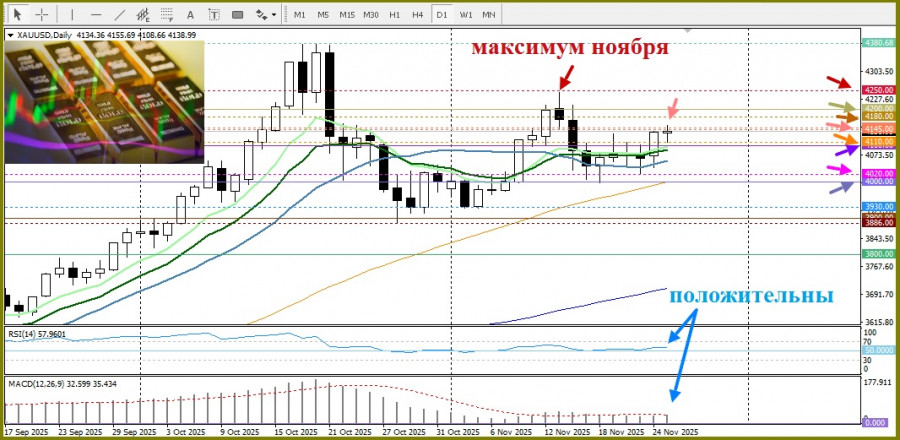 Также инвесторы следят за развитием событий продолжающихся мирных переговоров российско-украинского конфликта. С учётом геополитических рисков и перспективы декабрьского снижения ставки ФРС, краткосрочные перспективы золота остаются позитивными.