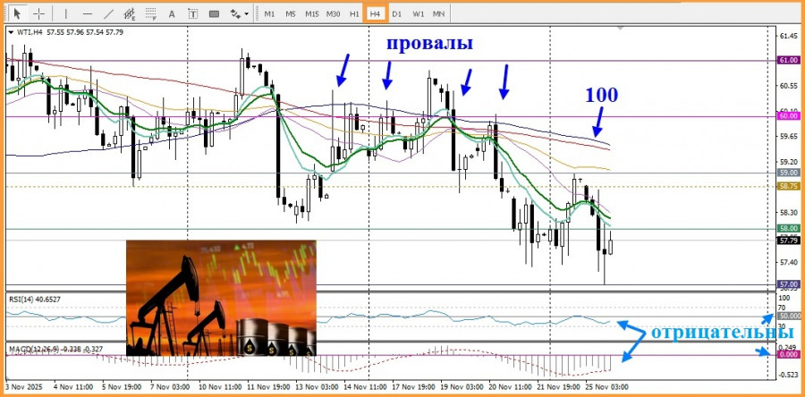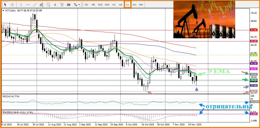 А с технической точки зрения, неоднократное падение цены на 4-часовом графике ниже 100-периодной простой скользящей средней, благоприятствует медведям. Осцилляторы на этом и дневном графике отрицательны, что тоже поддерживает медведей.Прочную поддержку цены нашли у круглого уровня $57,00, ниже которого цены ускорят падение к октябрьскому минимуму. А сопротивление у 9-дневной ЕМА перед круглым уровнем $58,00.