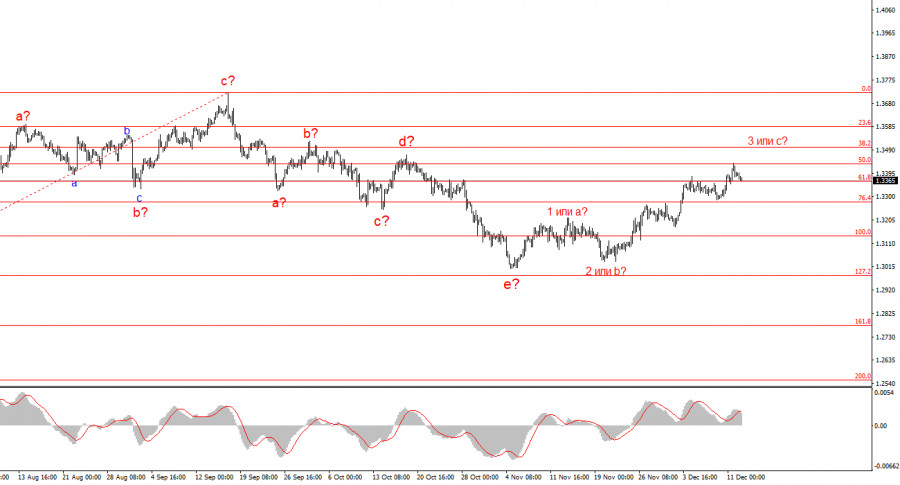 Вернемся к следующей неделе. Если на этой неделе спрос на валюту США снижался на фоне смягчения денежно-кредитной политики ФРС, то на следующей неделе он может снижаться на фоне смягчения денежно-кредитной политики Банка Англии. Напомню, что вероятность снижения ставки в Великобритании тоже очень велика. Но! В Америке на следующей неделе выйдут отчеты, которые лично я считаю даже более важными, чем прошедшее заседание ФРС. Комитет FOMC в среду действовал вслепую и предоставил самую нейтральную информацию из возможной на основании статистической пустоты. А на следующей неделе станут известны актуальные данные по рынку труда, безработице и инфляции, которые, несомненно, повлияют на решения ФРС в начале 2026 года. Поэтому инструмент GBP/USD вполне может оказаться под давлением, хоть это и будет противоречить волновой разметке.