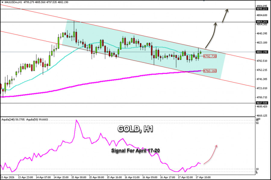 Vàng đang được giao dịch quanh mức 4.802 USD trong một kênh xu hướng giảm trên biểu đồ H1, được hình thành từ ngày 14 tháng 4. Biểu đồ cho thấy vàng đang tích lũy phía trên đường EMA 200 kỳ tại 4.760 USD, hàm ý rằng giá vàng có thể phục hồi trong những ngày tới, với khả năng tiến tới vùng kháng cự R_3 tại 4.898 USD.
