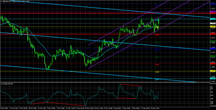 Độ biến động trung bình của cặp GBP/USD trong năm phiên giao dịch gần đây là 86 pips. Đối với cặp tiền tệ bảng Anh/đô la, giá trị này được cho là "trung bình." Do đó, vào thứ Sáu, ngày 19 tháng 12, chúng tôi dự kiến sẽ có sự di chuyển trong khoảng từ 1.3306 đến 1.3477. Kênh trên của hồi quy tuyến tính được hướng xuống, chỉ là do sự điều chỉnh kỹ thuật ở các khung thời gian cao hơn. Chỉ báo CCI đã vào vùng quá bán sáu lần trong vài tháng qua và hình thành nhiều sự phân kỳ "tăng giá," thường xuyên cảnh báo về việc nối lại xu hướng tăng. Tuần trước, chỉ báo này đã hình thành một phân kỳ tăng giá khác, nhưng tuần đã kết thúc với hai lần vào vùng quá mua và hai sự phân kỳ "giảm giá." Kết luận: điều chỉnh trong xu hướng tăng.