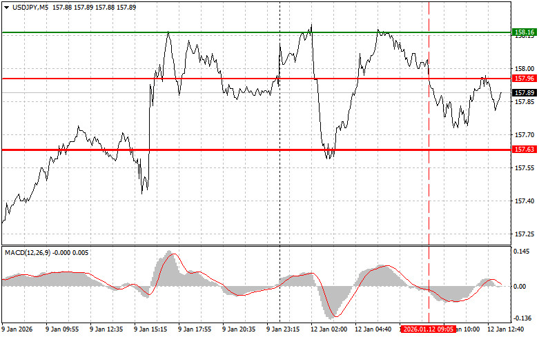 Kịch bản số 1: Tôi dự định mua USD/JPY hôm nay khi đạt đến điểm vào lệnh khoảng 158.00 (đường màu xanh trên biểu đồ), với mục tiêu tăng trưởng đến mức 158.39 (đường xanh dày hơn trên biểu đồ). Quanh mức 158.39, tôi sẽ thoát khỏi các vị trí mua dài hạn và mở các vị trí bán ngắn hạn theo hướng ngược lại (dự kiến một sự di chuyển từ 30–35 điểm theo hướng ngược từ mức đó). Có thể kỳ vọng sự tăng trưởng tiếp tục của cặp tiền theo xu hướng quan trọng! Trước khi mua, hãy chắc chắn rằng chỉ báo MACD trên đường zero và vừa bắt đầu tăng từ đó.