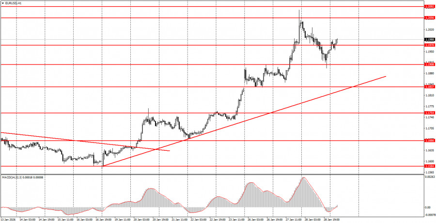 Không có điều gì đáng chú ý trong các sự kiện cơ bản vào thứ Năm. Cuộc họp của FOMC đã kết thúc tối qua, và kết quả của nó đã được các nhà giao dịch dự đoán trước. Mặc dù Jerome Powell nghi ngờ khả năng giảm lãi suất vào tháng Ba, điều này không giúp gì cho đồng đô la. Sau khi công bố kết quả cuộc họp, đồng tiền Mỹ lại bắt đầu giảm và hiện đang gần vùng thấp nhất trong 3-4 năm qua. Do đó, chúng tôi hoàn toàn chấp nhận khả năng tăng giá của đồng euro và bảng Anh có thể tiếp tục hôm nay, đặc biệt nếu Trump quyết định tấn công ai đó, tiến hành chiến dịch quân sự ở Iran hoặc tăng thuế. Đồng đô la hiện đang ở vị thế rất dễ bị tổn thương. Nó không có sự hỗ trợ nào cả.Vào ngày giao dịch áp chót của tuần, cả hai cặp tiền tệ sẽ giao dịch dựa trên các yếu tố kỹ thuật. Đồng euro có thể được giao dịch ngày hôm nay trong phạm vi từ 1.1970 đến 1.1988, và bảng Anh trong phạm vi từ 1.3814 đến 1.3833. Tất nhiên, đồng đô la sẽ không giảm giá mỗi ngày. Sẽ có những khoảng dừng, điều chỉnh và những thoái lui. Nhưng một đợt điều chỉnh đã diễn ra ngày hôm qua, và sự giảm giá của đồng đô la có thể sẽ tiếp tục ngày hôm nay.