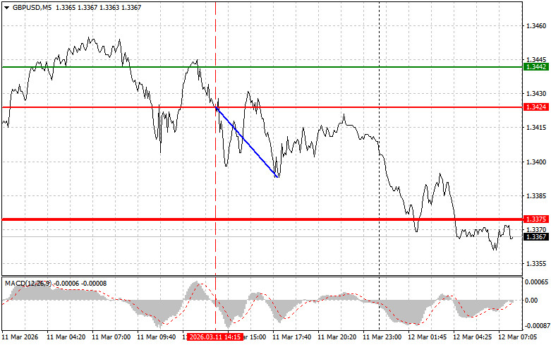 Kịch bản #1: Tôi dự định mua đồng bảng hôm nay khi giá chạm vùng vào lệnh quanh 1,3375 (đường màu xanh lá trên biểu đồ), với mục tiêu tăng lên 1,3403 (đường màu xanh lá đậm hơn trên biểu đồ). Quanh mức 1,3403, tôi dự định thoát khỏi thị trường và bán ngay khi giá bật xuống, kỳ vọng một nhịp đi ngược lại khoảng 30–35 pip từ mức này. Có thể kỳ vọng đồng bảng tăng giá sau lập trường cứng rắn của Andrew Bailey. Quan trọng! Trước khi mua, hãy bảo đảm chỉ báo MACD nằm trên vạch 0 và vừa mới bắt đầu đi lên từ đó.