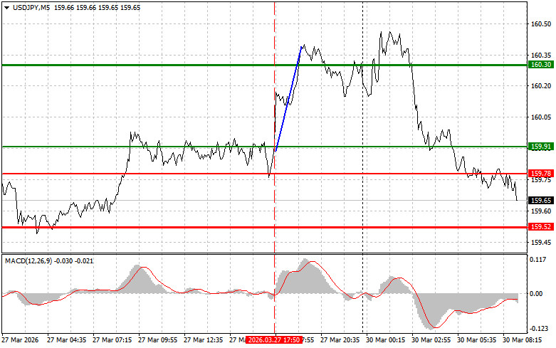 Kịch bản #1: Tôi dự định chỉ bán USD/JPY hôm nay sau khi mức 159,67 được xuyên thủng (đường màu đỏ trên biểu đồ), điều này sẽ kích hoạt một nhịp giảm mạnh của cặp tiền. Mục tiêu chính của phe bán sẽ là vùng 159,37, nơi tôi có ý định chốt các lệnh bán và lập tức mua ngược trở lại (nhắm tới nhịp hồi khoảng 20–25 pip theo hướng ngược lại tính từ vùng giá này). Bán ở mức giá càng cao càng tốt. Quan trọng! Trước khi bán, hãy đảm bảo chỉ báo MACD nằm dưới ngưỡng 0 và vừa mới bắt đầu di chuyển đi xuống.