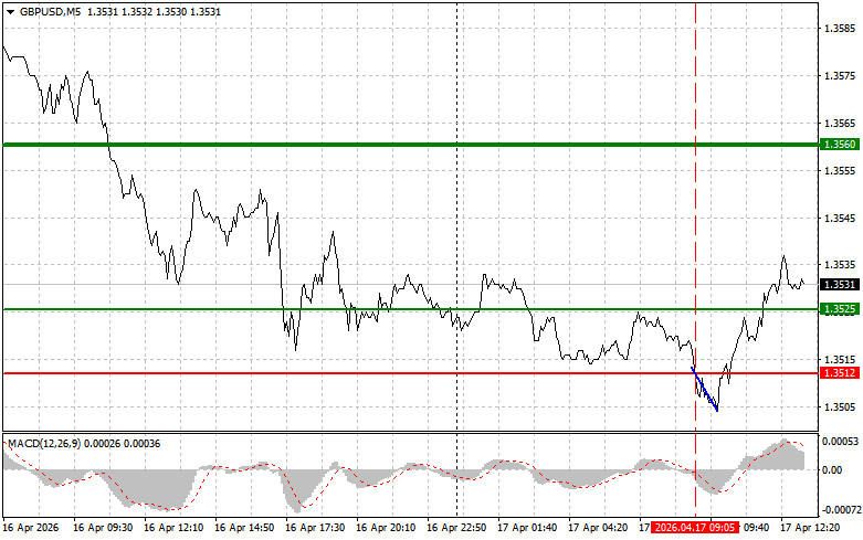 Kịch bản số 1: Tôi dự định bán đồng bảng sau khi phá vỡ mức 1.3525 (đường màu đỏ trên biểu đồ), điều này có thể dẫn đến một nhịp giảm mạnh. Mục tiêu chính của bên bán sẽ là 1.3496, tại đó tôi dự định chốt các vị thế bán và mở vị thế mua ngược lại (kỳ vọng biên độ dịch chuyển khoảng 20–25 điểm). Áp lực lên đồng bảng sẽ quay trở lại nếu các đại diện của Fed có quan điểm diều hâu. Quan trọng: Trước khi bán, hãy đảm bảo chỉ báo MACD nằm dưới đường 0 và vừa bắt đầu đi xuống.