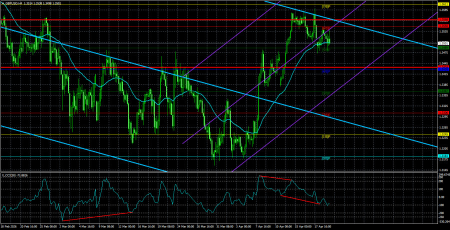 Độ biến động trung bình của cặp GBP/USD trong 5 ngày giao dịch gần nhất là 67 pip, được xem là “trung bình”. Vào thứ Tư, ngày 22 tháng 4, chúng tôi kỳ vọng cặp tiền sẽ giao dịch trong biên độ từ 1,3434 đến 1,3568. Kênh hồi quy tuyến tính phía trên đã quay đầu đi xuống, báo hiệu xu hướng giảm. Chỉ báo CCI đã đi vào vùng quá mua và hình thành phân kỳ “giảm giá”, cảnh báo khả năng xuất hiện nhịp điều chỉnh đi xuống.