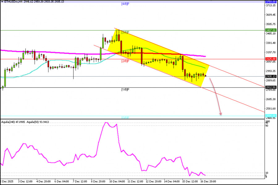 يتداول الإيثريوم (ETH/USD) حول مستوى 2,935 دولار، ضمن قناة هبوطية تشكلت منذ 10 ديسمبر، وتحت المتوسط المتحرك البسيط لـ 21 يوماً والمتوسط المتحرك الأسي لـ 200 يوم، مما يزيد الضغط على العملة المشفرة.