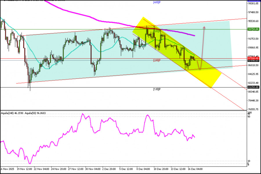 يتداول البيتكوين حول 87,098 دولار، وهو أقل من المتوسط المتحرك البسيط لـ 21 يوماً وأقل من المتوسط المتحرك الأسي لـ 200 يوماً، مما يشير إلى أنه قد يستمر في الانخفاض في الأيام القادمة وقد يصل إلى 1/8 موراي حول 80,000 دولار.
