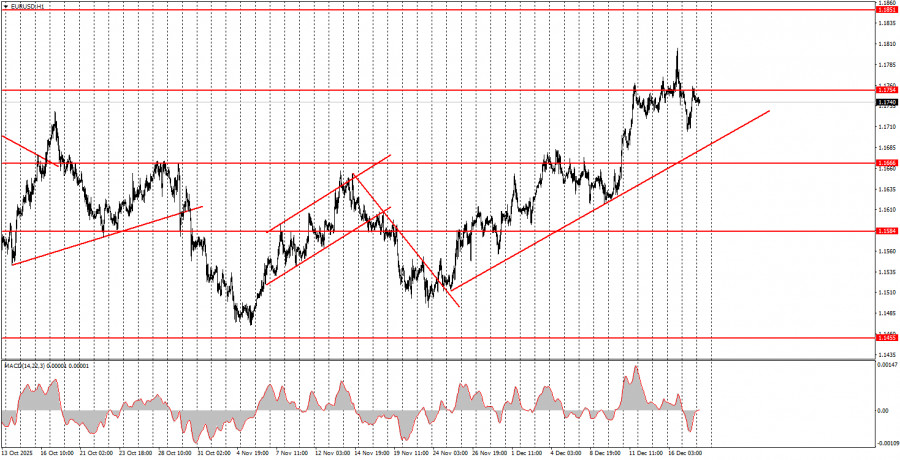 Валутава двойка EUR/USD се коригира надолу в сряда, но възходящата тенденция остава непокътната, както ясно е показано в илюстрацията по-горе. Вчера еврото спадна рязко, въпреки че липсва съществен макроикономически и фундаментален фон. Търговците може да са почувствали, че започва низходяща тенденция, което е напълно възможно, тъй като цената достигна горната граница на страничния канал от 1.1400-1.1830 на дневния времеви интервал. Въпреки това флатът продължи шест месеца и рано или късно трябва да приключи. Така че, вярваме, че все още е твърде рано за паника и очакване на нов спад на двойката. Възможно е растежът да продължи. Днес предстои публикуване на важен доклад за инфлацията в САЩ, който може да предизвика волатилност и да отслаби долара. Ако инфлацията започне да забавя, това ще увеличи вероятността за ново намаление на лихвения процент на Федералния резерв през януари. Ще се проведе и среща на Европейската централна банка, но на този етап не се очакват значителни решения, въпреки че винаги са възможни изненади. Цената продължава да се задържа над трендовата линия, така че има малко основания да се очаква спад.