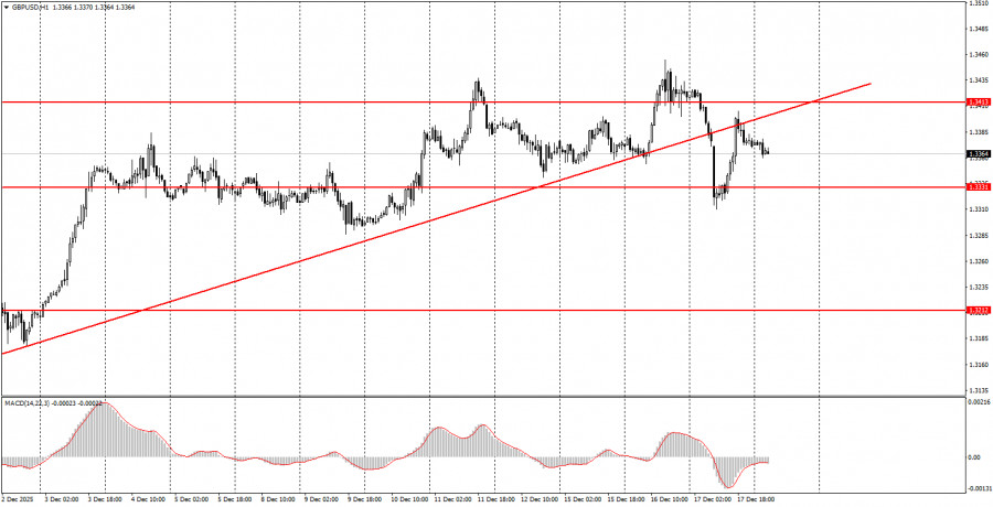 Двойката GBP/USD отбеляза рязък спад в сряда, възстанови се и след това възобнови движението си в низходяща посока. Възходящата тренд линия беше пробита, така че корекция може да настъпи в близкото бъдеще. Вчера беше публикуван докладът за инфлацията във Великобритания, предоставящ окончателни заключения относно решението на Английската централна банка по отношение на паричната политика, което е насрочено за днес. Няма съмнения, че британската централна банка ще намали основния лихвен процент, което е неблагоприятен фактор за британската валута. Въпреки че това решение може вече до известна степен да е оценено на пазара, спад може да се наблюдава и днес, тъй като BoE може да приеме по-мек подход през 2026 г., отколкото очаква пазарът. Освен това, инфлацията в САЩ остава един от най-съществените показатели. Докладите за трудовия пазар в САЩ за ноември бяха доста противоречиви, но бихме ги определили като предимно негативни. Поради тази причина, спад в инфлацията в САЩ би могъл да доведе до понижение на долара, тъй като пазарът очаква допълнителни облекчения от Федералния резерв. Търговците могат да очакват пореден натоварен ден днес, а волатилността вероятно ще остане висока.