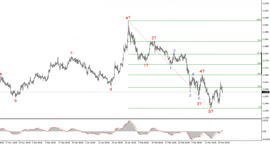 В горепосочената графика може да се идентифицира класическа петвълнова импулсна структура, с разширена трета вълна. Ако тази интерпретация е верна, тогава тази структура вече е завършена, и се очаква поне тривълнов корективен модел. Затова в близката перспектива е вероятно увеличение на пасивите – но в рамките на корекция по отношение на последния сегмент на тенденцията. Последните вълнови формации не се вписват добре в структурата на по-високо ниво, но ситуацията трябва да стане по-ясна с течение на времето. В краткосрочен план еврото може да се възвърне към 1.1568 и 1.1666.