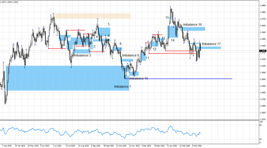 英鎊的長期前景仍偏多。然而,目前並沒有任何有效的看漲形態,僅有來自不平衡 17 的賣出訊號,短期內可能為空頭提供支撐。必須再次強調美元近期強勢的脆弱性。近幾週該貨幣對的急跌,是一連串不利因素疊加的結果。若沒有伊朗相關緊張局勢升溫以及在波斯灣的軍事行動,美元不太可能出現如此強勁的漲勢。這一波下跌很可能會像一開始那樣,出人意料地突然結束。然而,就目前來看,空頭動能依舊存在。儘管不平衡 17 已失效,匯價卻再度對一個較小的不平衡區作出反應,意味著該貨幣對可能繼續回落,朝 1.3000–1.3100 區間尋求支撐。