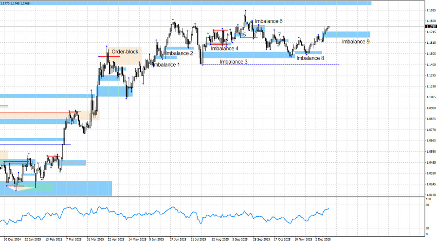 The chart picture continues to signal bullish dominance. The bullish trend remains intact; a reaction from bullish imbalance 3 has been received, and a reaction from bullish imbalance 8 has also been observed. Despite the fairly prolonged decline in the European currency, the dollar failed to break the bullish trend. It had five months to do so and achieved no result. Last week, a new bullish imbalance 9 was formed, which now serves as another area of interest and a support zone for the bulls. I would also like to remind once again that if bearish patterns appear or signs of a breakdown of the bullish trend emerge, the strategy can be adjusted. At the present moment, however, nothing points to this.