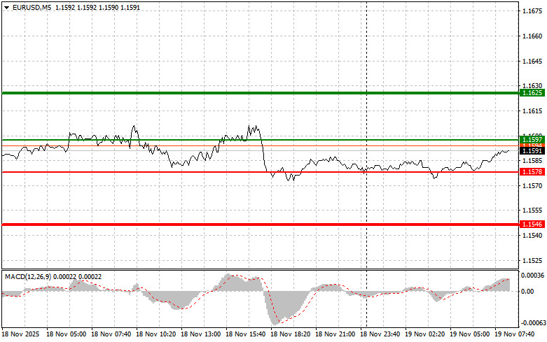 Сценарий №2: продавать евро сегодня также собираюсь в случае двух подряд тестов цены 1.1597 в момент, когда индикатор MACD будет находиться в области перекупленности. Это ограничит восходящий потенциал пары и приведет к обратному развороту рынка вниз. Можно ожидать снижения к противоположному уровню 1.1578 и 1.1546.