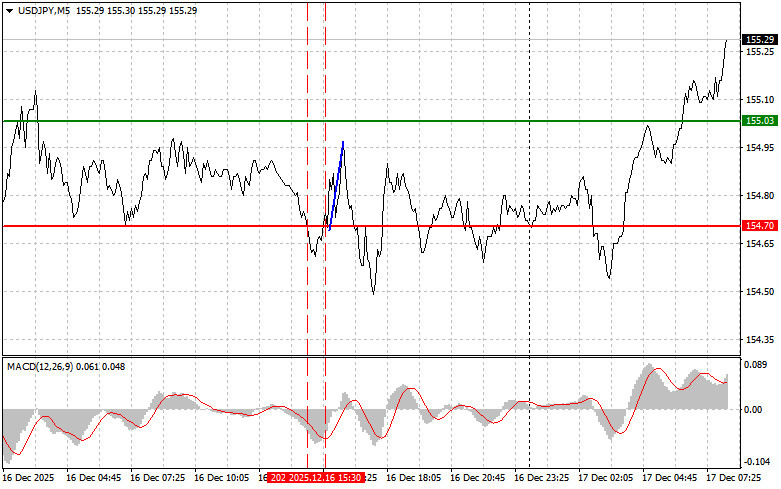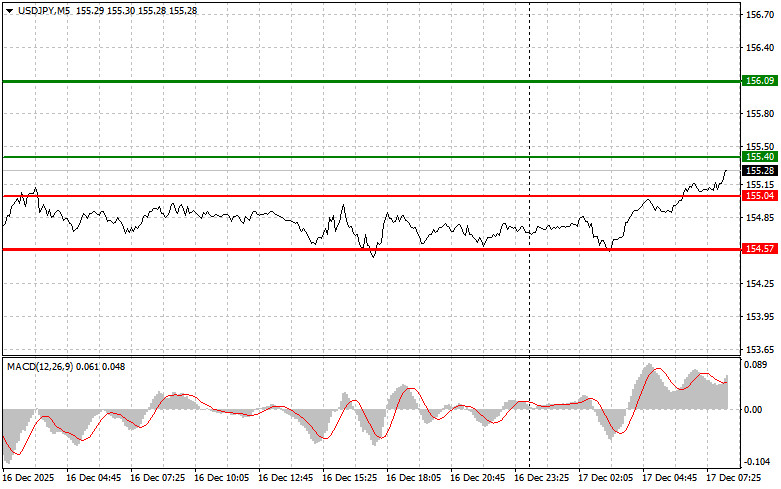 Сценарий №2: продавать USD/JPY сегодня также планирую в случае двух подряд тестов цены 155.40 в момент, когда индикатор MACD будет находиться в области перекупленности. Это ограничит восходящий потенциал пары и приведет к обратному развороту рынка вниз. Можно ожидать снижения к противоположному уровню 155.04 и 154.57.