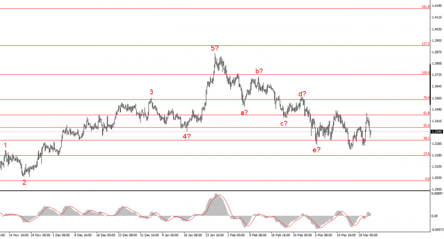 По инструменту GBP/USD волновая разметка продолжает свидетельствовать о построении повышательного участка тренда(нижняя картинка), но в более краткосрочном плане началось построение сложной и протяженной коррекционной структуры, которая может стать самостоятельным трендом. Безусловно, без войны в Иране и стремительного роста цен на энергоносители понижательный набор волн ограничился бы стандартными тремя. Однако этот тот случай, когда новостной фон привел к существенному видоизменению волновой разметки. Волновая разметка не может влиять на новостной фон, не может его заблокировать. Новостной фон может влиять на волновую разметку.